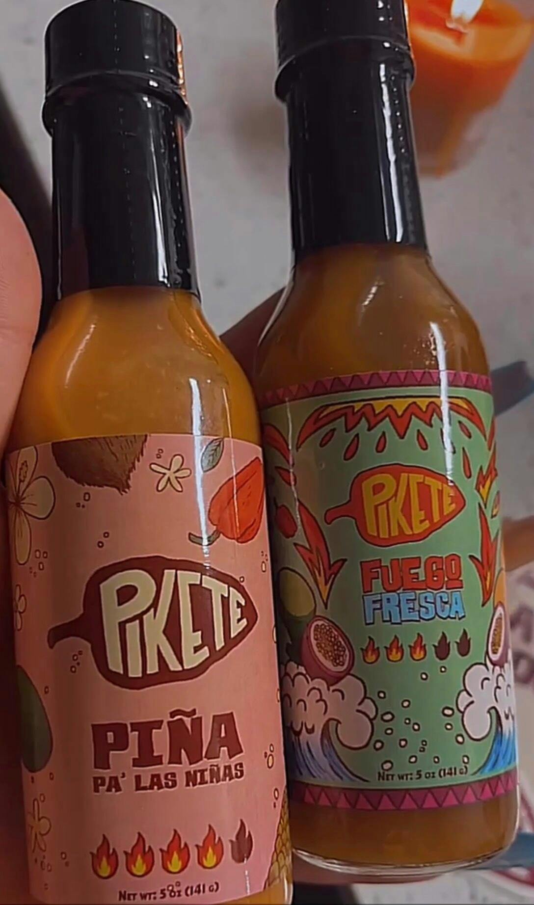 Fuego Fresca Ingredients: Passion Fruit, Habanero Hot Sauce (distilled vinegar, habanero peppers, salt, dried carrots, dried onion, dried garlic, xanthan gum), Brown Sugar, Orange Juice, Jalapeno Peppers, Lime Juice, Apple Cider Vinegar, Garlic, Citric Acid, Sea Salt, Natural Flavors. Piña Pa Las Niñas ingredients: Pineapple, Coconut Milk (coconut extract, water, citric acid, sodium metabisulfite (as a preservative), Habanero Peppers, Apple Cider Vinegar, Water, Brown Sugar, Lime Juice, Sea Salt, Coconut Extract (water, alcohol (21%), propylene glycol, artificial flavor).